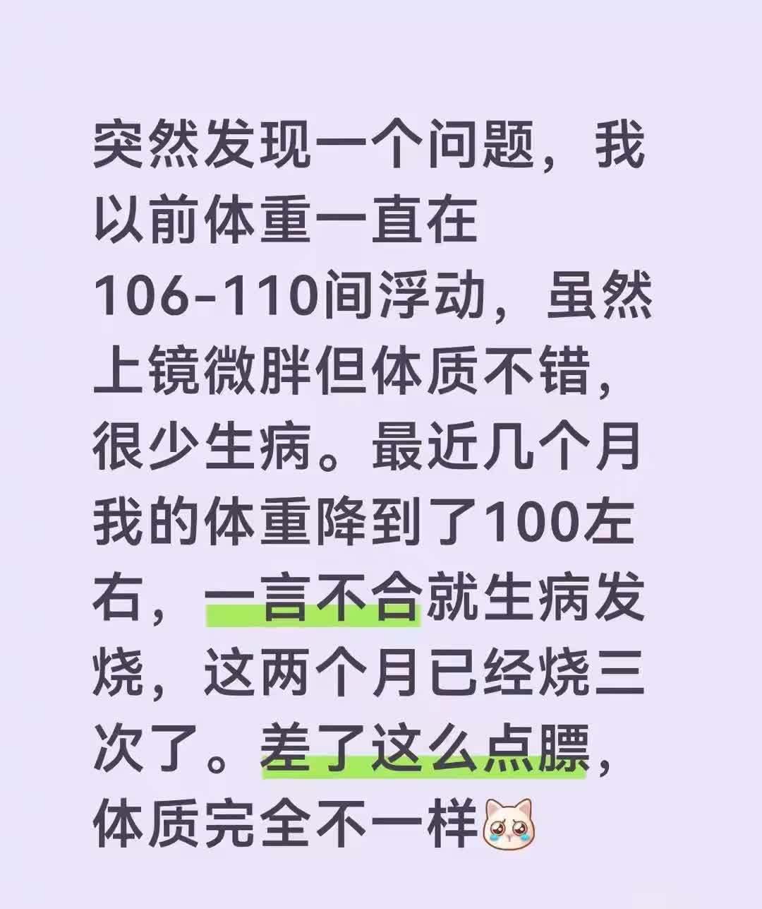 这件事并非明星矫情,普通人也常常在此踩坑:为了显瘦节食、断碳水,最终要么姨妈紊乱,要么一吹冷风就感冒。正如网友所说“我胖�斤后,反而好几年没发烧”,适度的肉量确实是给身体“充buff” !